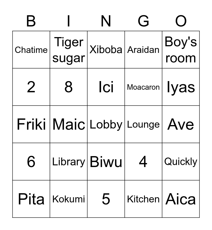 This bingo card has a free space and 24 words: Library, Kokumi, Ici, Pita, Boy's room, Chatime, 2, Tiger sugar, Lounge, Biwu, Moacaron, Friki, 4, Quickly, 8, Kitchen, Ave, Xiboba, Iyas, Maic, Aica, 6, Araidan and 5.
