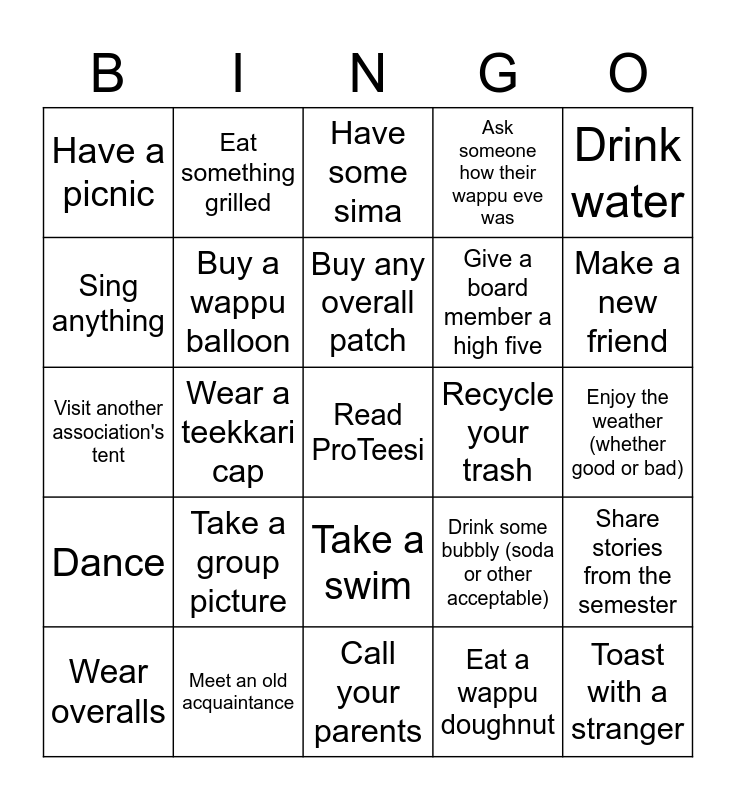 This bingo card has a free space and 24 words: Take a group picture, Meet an old acquaintance, Buy any overall patch, Wear overalls, Drink water, Have a picnic, Sing anything, Eat something grilled, Recycle your trash, Take a swim, Give a board member a high five, Visit another association's tent, Drink some bubbly (soda or other acceptable), Share stories from the semester, Buy a wappu balloon, Eat a wappu doughnut, Enjoy the weather (whether good or bad), Have some sima, Make a new friend, Wear a teekkari cap, Toast with a stranger, Dance, Ask someone how their wappu eve was and Call your parents.