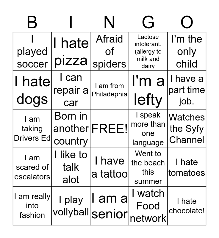 This bingo card has a free space and 24 words: I like to talk alot, I play vollyball, I am from Philadephia, I am really into fashion, I'm the only child, I played soccer, I hate dogs, I hate pizza, I speak more than one language, I have a tattoo, I'm a lefty, I am taking Drivers Ed, Went to the beach this summer, I hate tomatoes, I can repair a car, I watch Food network, Watches the Syfy Channel, Afraid of spiders, I have a part time job., Born in another country, I hate chocolate!, I am scared of escalators, Lactose intolerant. (allergy to milk and dairy and I am a senior.