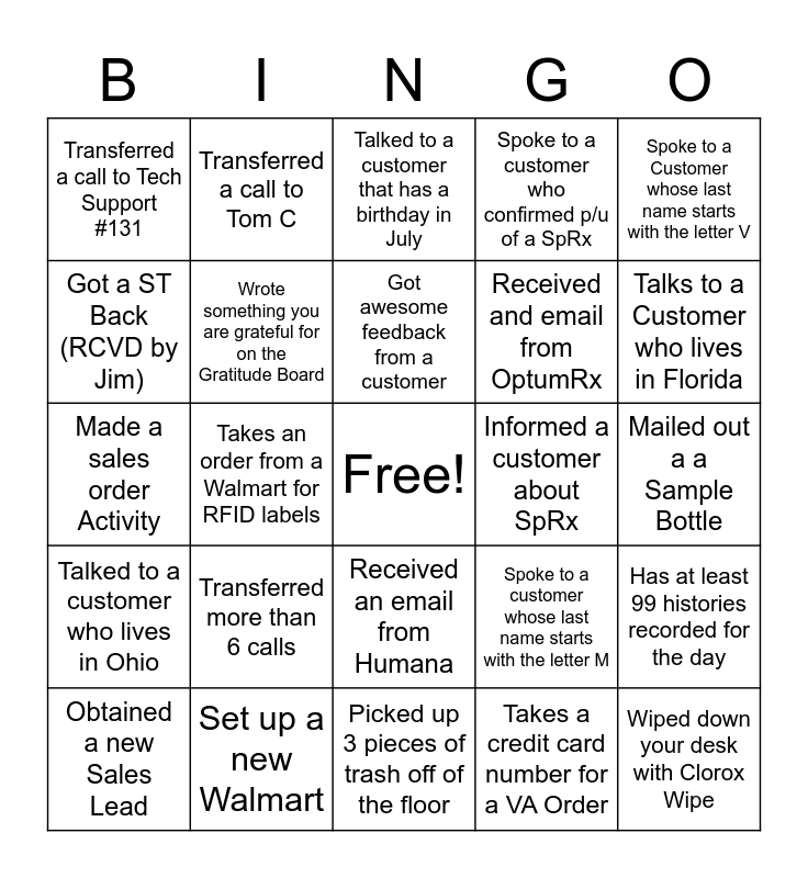 This bingo card has a free space and 24 words: Transferred more than 6 calls, Set up a new Walmart, Got awesome feedback from a customer, Obtained a new Sales Lead, Spoke to a Customer whose last name starts with the letter V, Transferred a call to Tech Support #131, Got a ST Back (RCVD by Jim), Transferred a call to Tom C, Informed a customer about SpRx, Received an email from Humana, Received and email from OptumRx, Made a sales order Activity, Spoke to a customer whose last name starts with the letter M, Has at least 99 histories recorded for the day, Wrote something you are grateful for on the Gratitude Board, Takes a credit card number for a VA Order, Mailed out a a Sample Bottle, Talked to a customer that has a birthday in July, Talks to a Customer who lives in Florida, Takes an order from a Walmart for RFID labels, Wiped down your desk with Clorox Wipe, Talked to a customer who lives in Ohio, Spoke to a customer who confirmed p/u of a SpRx and Picked up 3 pieces of trash off of the floor.