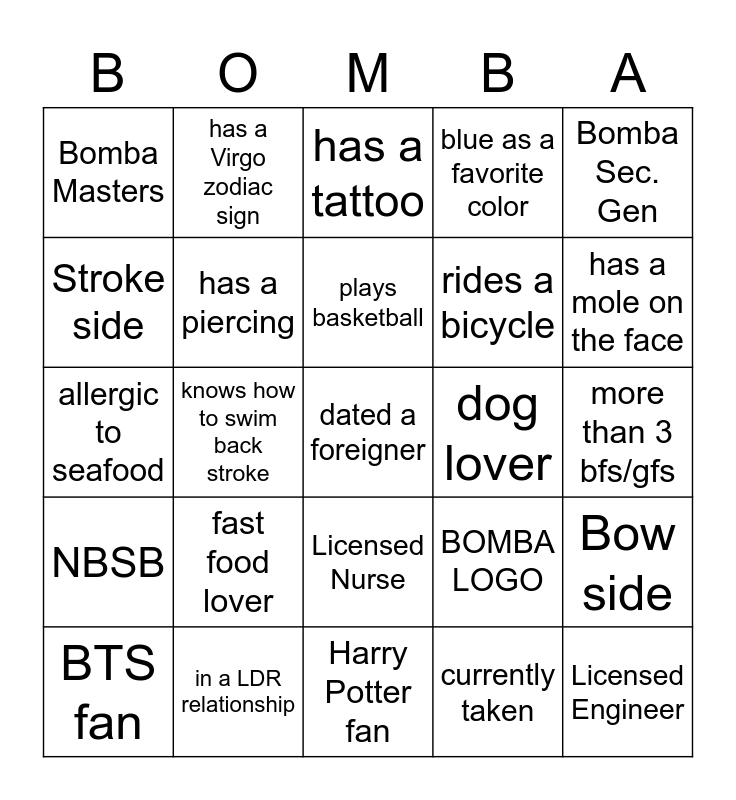 This bingo card has 25 words: fast food lover, Harry Potter fan, plays basketball, BTS fan, Bomba Sec. Gen, Bomba Masters, Stroke side, has a Virgo zodiac sign, dog lover, Licensed Nurse, rides a bicycle, allergic to seafood, BOMBA LOGO, Bow side, has a piercing, Licensed Engineer, more than 3 bfs/gfs, has a tattoo, has a mole on the face, knows how to swim back stroke, dated a foreigner, in a LDR relationship, NBSB, blue as a favorite color and currently taken.