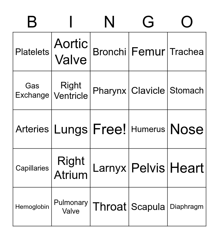 This bingo card has a free space and 54 words: Red Blood Cells, Right Atrium, Nose, Ribs, Nose, White Blood Cells, Right Ventricle, Mouth, Femur, Mouth, Platelets, Left Atrium, Scapula, Heart, Plasma, Left Ventricle, Pharynx, Clavicle, Lungs, Hemoglobin, Pulmonary Valve, Throat, Humerus, Trachea, Cardiac Veins, Aortic Valve, Larnyx, Radius, Brain, Cardiac Arteries, Mitral Valve, Trachea, Ulna, Bone Marrow, Gas Exchange, Tricuspid Valve, Bronchi, Pelvis, Diaphragm, Arteries, Pulmonary Arteries, Bronchioles, Skull, Larynx, Veins, Pulmonary Veins, Alveoli, Spine, Stomach, Capillaries, Lungs, Diaphragm, Tibia and Skin.