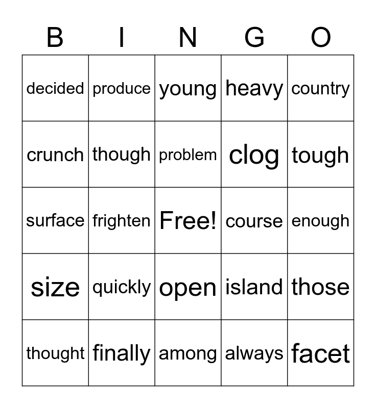This bingo card has a free space and 24 words: quickly, finally, problem, thought, country, decided, crunch, produce, course, open, clog, surface, island, those, though, always, enough, young, tough, frighten, facet, size, heavy and among.