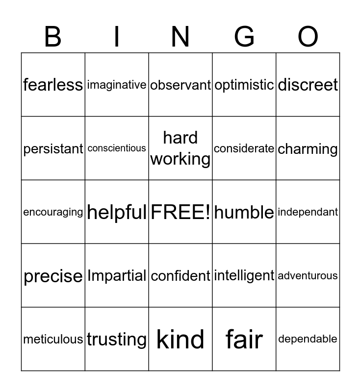 This bingo card has a free space and 24 words: Impartial, trusting, hard working, meticulous, discreet, fearless, persistant, imaginative, humble, confident, considerate, encouraging, intelligent, adventurous, conscientious, fair, independant, observant, charming, helpful, dependable, precise, optimistic and kind.
