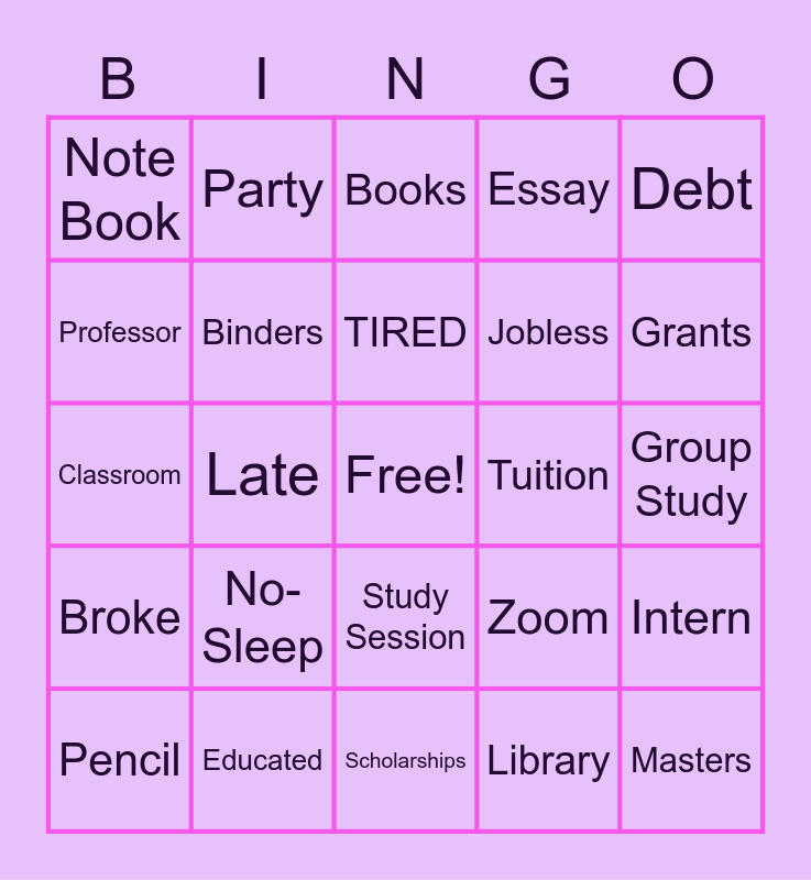 This bingo card has a free space and 24 words: No-Sleep, Educated, TIRED, Pencil, Debt, Note Book, Professor, Party, Tuition, Study Session, Jobless, Classroom, Zoom, Intern, Binders, Library, Group Study, Books, Grants, Late, Masters, Broke, Essay and Scholarships.