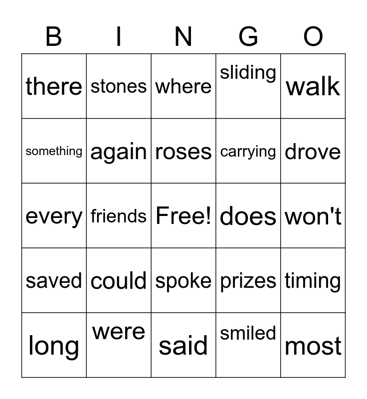 This bingo card has a free space and 29 words: long, missed, friends, here, there, where, again, could, does, were, won't, most, said, smiled, drove, scared, spoke, saved, walk, every, prizes, waving, carrying, something, sliding, stones, timing, roses and trading.