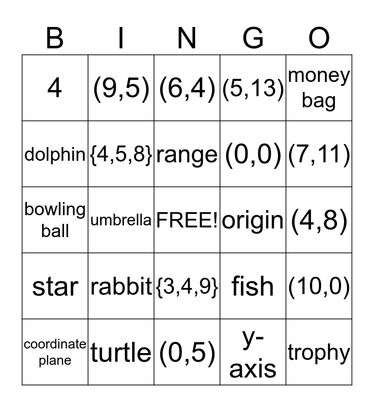 This bingo card has a free space and 30 words: turtle, handprint, umbrella, 5, 4, (6,4), {4,5,8}, {3,4,9}, origin, (0,5), (4,8), trophy, y-axis, x-axis, (7,11), football, fish, star, rabbit, money bag, bowling ball, leaf, (9,5), (0,0), dolphin, (5,13), (10,0), coordinate plane, range and domain.