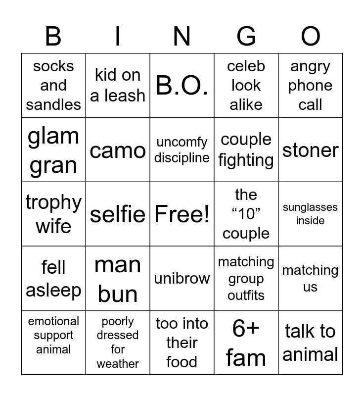 This bingo card has a free space and 24 words: man bun, poorly dressed for weather, uncomfy discipline, emotional support animal, angry phone call, socks and sandles, glam gran, kid on a leash, the “10” couple, unibrow, couple fighting, trophy wife, matching group outfits, matching us, camo, 6+ fam, sunglasses inside, B.O., stoner, selfie, talk to animal, fell asleep, celeb look alike and too into their food.