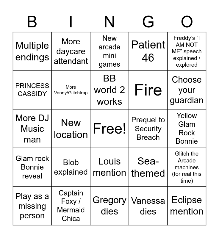 This bingo card has a free space and 24 words: Blob explained, Captain Foxy / Mermaid Chica, BB world 2 works, Play as a missing person, Freddy’s “I AM NOT ME” speech explained / explored, Multiple endings, PRINCESS CASSIDY, More daycare attendant, Prequel to Security Breach, Louis mention, Fire, More DJ Music man, Sea-themed, Glitch the Arcade machines (for real this time), More Vanny/Glitchtrap, Vanessa dies, Yellow Glam Rock Bonnie, New arcade mini games, Choose your guardian, New location, Eclipse mention, Glam rock Bonnie reveal, Patient 46 and Gregory dies.