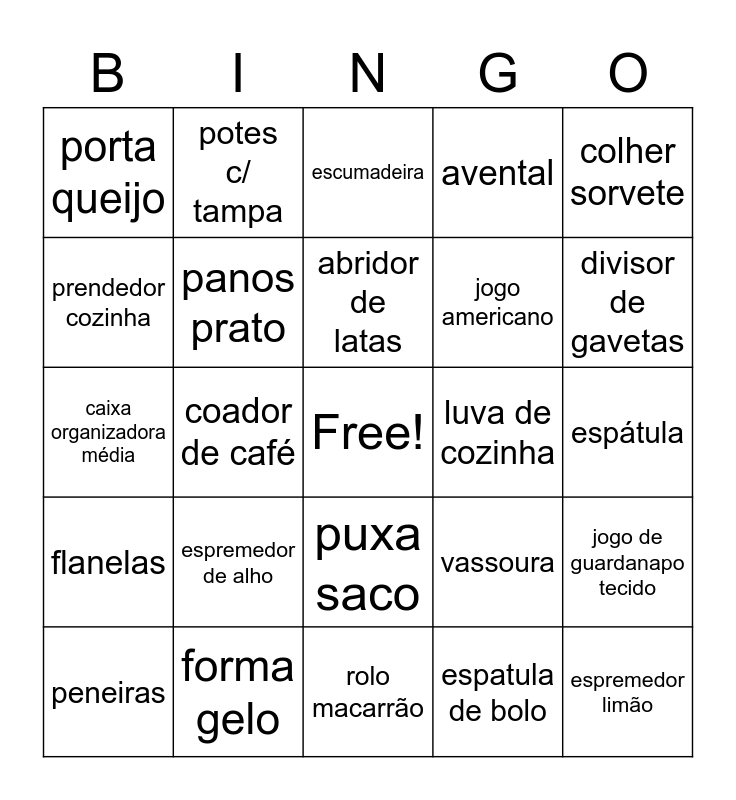 This bingo card has a free space and 36 words: lençol casal, prendedor de roupas, cabides, panos prato, vassoura, flanelas, abridor de latas, rodo pia, colher sorvete, concha de silicone, coador de café, avental, desentupidor de pia, luva de cozinha, divisor de gavetas, porta queijo, porta frios, espremedor de alho, espremedor limão, escumadeira, espátula, jogo de guardanapo tecido, forma gelo, peneiras, rolo macarrão, potes c/ tampa, caixa organizadora média, cx.organizadora pequena, jogo americano, prendedor cozinha, panos chão, porta bolo, espatula de bolo, puxa saco, centrifuga de salada and descanso de colher.