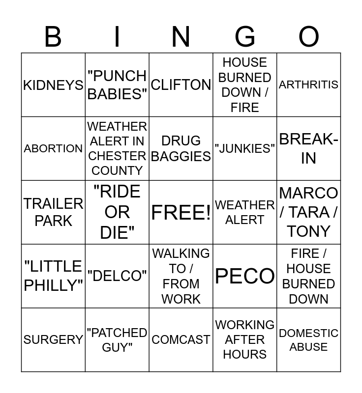 This bingo card has a free space and 24 words: "DELCO", "PATCHED GUY", DRUG BAGGIES, SURGERY, ARTHRITIS, KIDNEYS, ABORTION, "PUNCH BABIES", WEATHER ALERT, WALKING TO / FROM WORK, "JUNKIES", TRAILER PARK, PECO, FIRE / HOUSE BURNED DOWN, WEATHER ALERT IN CHESTER COUNTY, WORKING AFTER HOURS, MARCO / TARA / TONY, CLIFTON, BREAK-IN, "RIDE OR DIE", DOMESTIC ABUSE, "LITTLE PHILLY", HOUSE BURNED DOWN / FIRE and COMCAST.