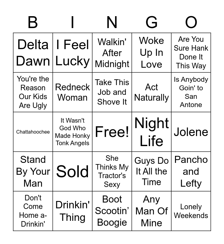 This bingo card has a free space and 34 words: Whiskey River, Any Man Of Mine, Ring of Fire, You Never Even Called Me by My Name, Stand By Your Man, Redneck Woman, Are You Sure Hank Done It This Way, Don't Come Home a-Drinkin', I Feel Lucky, I Saw the Light, Take This Job and Shove It, Walkin' After Midnight, Dust on the Bottle, Forever and Ever, Amen, Night Life, Is Anybody Goin' to San Antone, Drinkin' Thing, Chattahoochee, Sold, Guys Do It All the Time, She Thinks My Tractor's Sexy, Amarillo by Morning, Delta Dawn, Jolene, Boot Scootin’ Boogie, Lonely Weekends, Woke Up In Love, Family Tradition, Act Naturally, You're the Reason Our Kids Are Ugly, Heads Carolina, Tails California, It Wasn't God Who Made Honky Tonk Angels, Pancho and Lefty and Rocket.