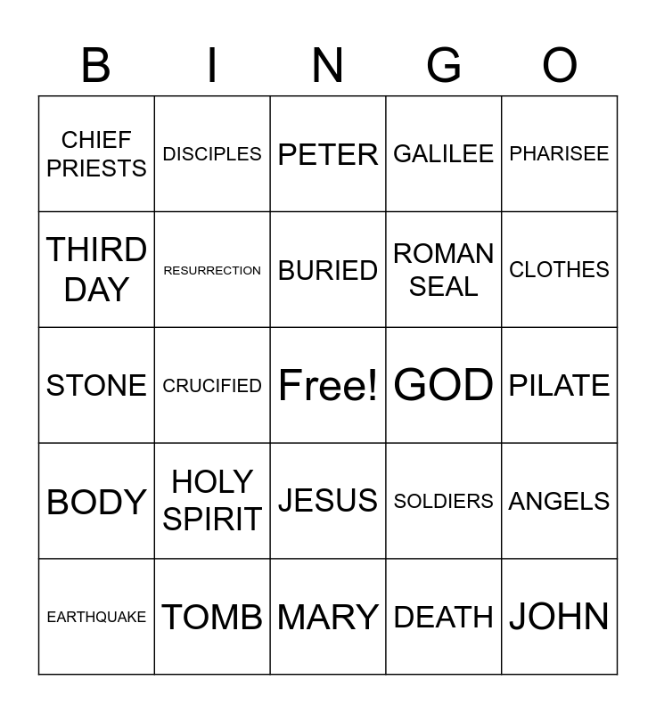 This bingo card has a free space and 26 words: JESUS, DEATH, BURIED, TOMB, PHARISEE, CHIEF PRIESTS, THIRD DAY, DISCIPLES, PILATE, SOLDIERS, ROMAN SEAL, STONE, ANGELS, EARTHQUAKE, CRUCIFIED, RISEN, GALILEE, BODY, PETER, JOHN, CLOTHES, MARY, GOD, HOLY SPIRIT, RESURRECTION and GOSPEL.