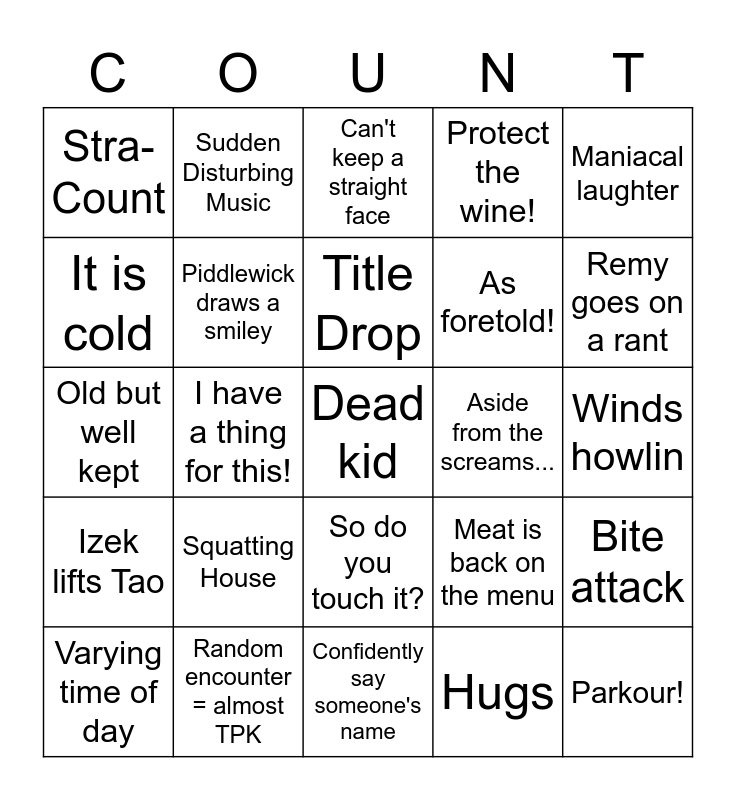 This bingo card has a free space and 24 words: Squatting House, Random encounter = almost TPK, Title Drop, Varying time of day, Maniacal laughter, Stra- Count, It is cold, Sudden Disturbing Music, Aside from the screams..., So do you touch it?, As foretold!, Old but well kept, Meat is back on the menu, Bite attack, Piddlewick draws a smiley, Hugs, Winds howlin, Can't keep a straight face, Remy goes on a rant, I have a thing for this!, Parkour!, Izek lifts Tao, Protect the wine! and Confidently say someone's name.