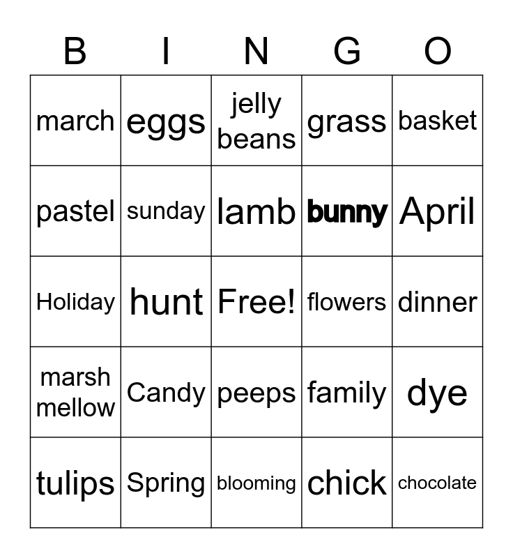 This bingo card has a free space and 24 words: Candy, Spring, lamb, tulips, basket, march, pastel, eggs, flowers, peeps, bunny, Holiday, family, dye, sunday, chick, dinner, jelly beans, April, hunt, chocolate, marsh mellow, grass and blooming.