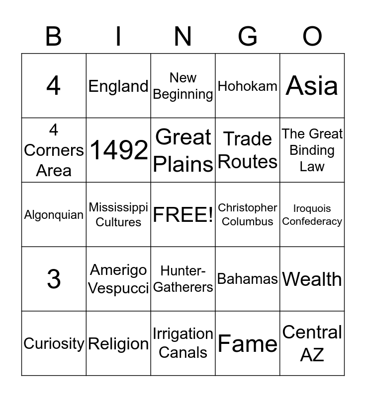 This bingo card has a free space and 24 words: Amerigo Vespucci, Religion, Great Plains, Curiosity, Asia, 4, 4 Corners Area, England, Christopher Columbus, Hunter-Gatherers, Trade Routes, Algonquian, Bahamas, Wealth, 1492, Fame, Iroquois Confederacy, New Beginning, The Great Binding Law, Mississippi Cultures, Central AZ, 3, Hohokam and Irrigation Canals.