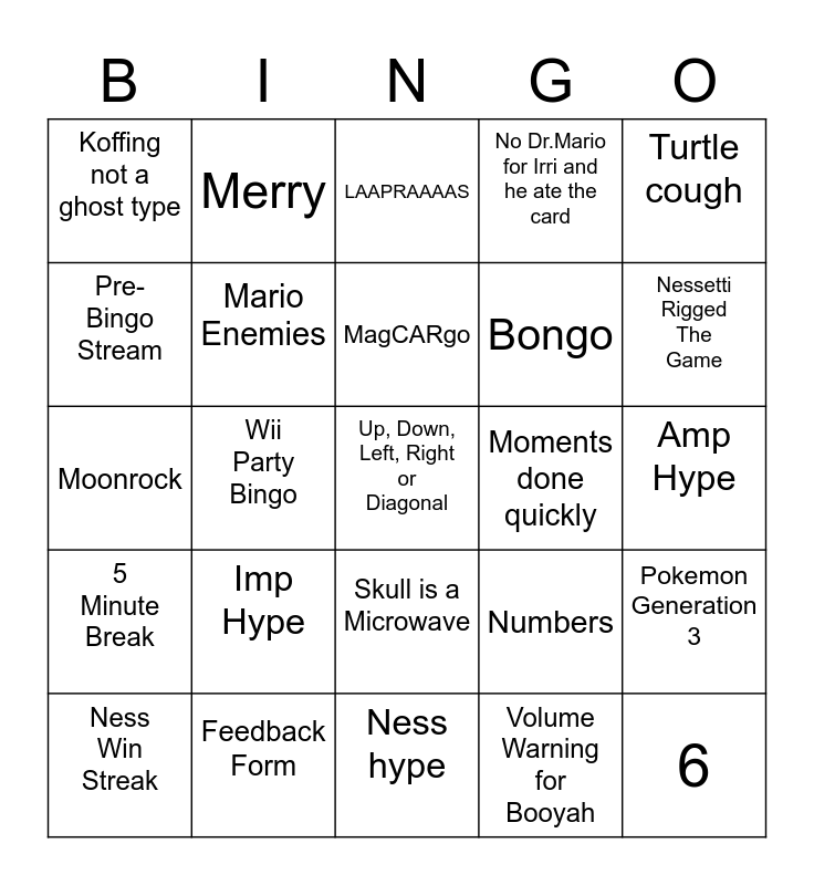 This bingo card has 25 words: Imp Hype, Ness hype, MagCARgo, Ness Win Streak, Turtle cough, Koffing not a ghost type, Pre-Bingo Stream, Merry, Moments done quickly, Skull is a Microwave, Bongo, Moonrock, Numbers, Pokemon Generation 3, Mario Enemies, 6, Amp Hype, LAAPRAAAAS, Nessetti Rigged The Game, Wii Party Bingo, Up, Down, Left, Right or Diagonal, Feedback Form, 5 Minute Break, No Dr.Mario for Irri and he ate the card and Volume Warning for Booyah.