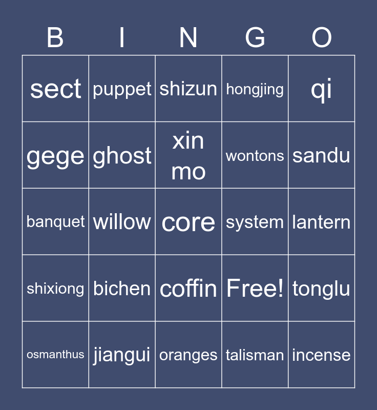 This bingo card has 25 words: bichen, oranges, xin mo, osmanthus, qi, sect, gege, puppet, system, coffin, wontons, banquet, Free!, tonglu, ghost, incense, lantern, shizun, sandu, willow, core, jiangui, shixiong, hongjing and talisman.