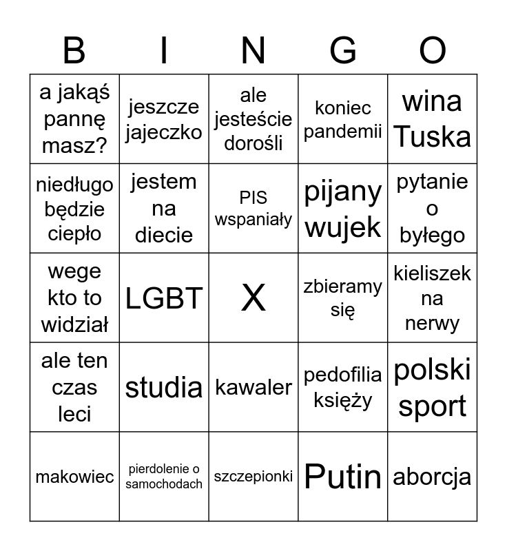 This bingo card has a free space and 24 words: studia, pierdolenie o samochodach, PIS wspaniały, makowiec, wina Tuska, a jakąś pannę masz?, niedługo będzie ciepło, jeszcze jajeczko, zbieramy się, kawaler, pijany wujek, wege kto to widział, pedofilia księży, polski sport, jestem na diecie, Putin, kieliszek na nerwy, ale jesteście dorośli, pytanie o byłego, LGBT, aborcja, ale ten czas leci, koniec pandemii and szczepionki.