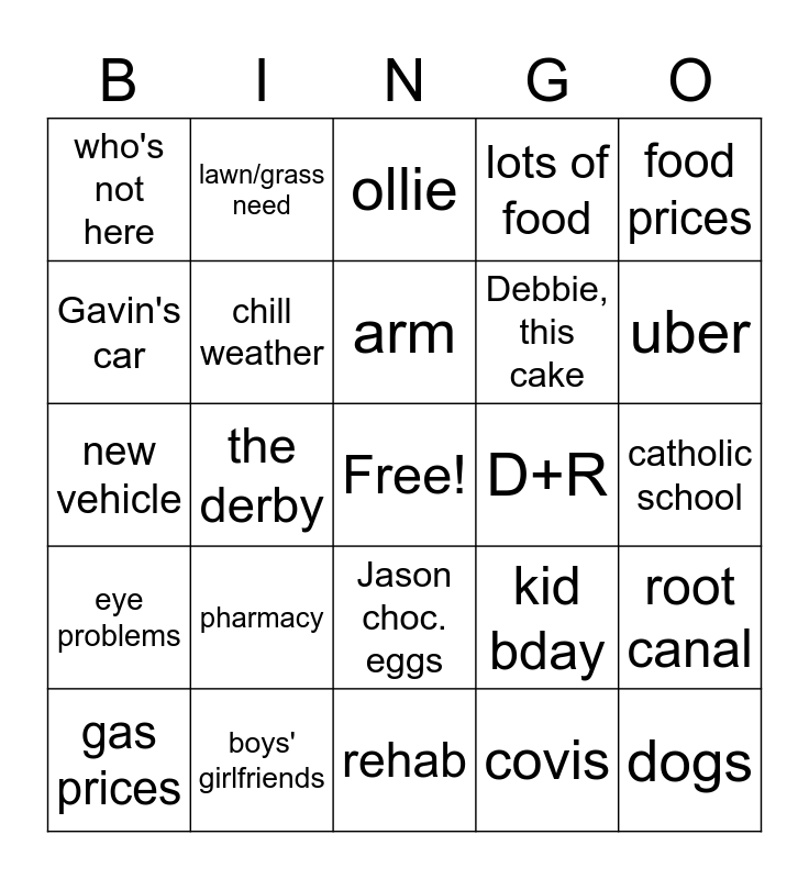 This bingo card has a free space and 25 words: pharmacy, rehab, arm, gas prices, food prices, who's not here, Gavin's car, lawn/grass need, D+R, Jason choc. eggs, Debbie, this cake, new vehicle, kid bday, root canal, chill weather, Deb's vacation, catholic school, ollie, uber, the derby, dogs, boys' girlfriends, eye problems, lots of food and covis.