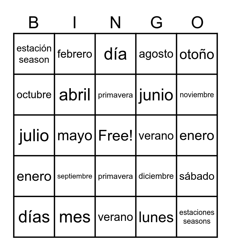 This bingo card has a free space and 62 words: calendario, mes, meses, enero, febrero, marzo, abril, mayo, junio, julio, agosto, septiembre, octubre, noviembre, diciembre December, estación season, estaciones seasons, otoño, invierno, primavera, verano, día, días, lunes, martes, miércoles, jueves, viernes, sábado, domingo, cumpleaños, calendario, mes, meses, enero, febrero, marzo, abril, mayo, junio, julio, agosto, septiembre, octubre, noviembre, diciembre, estación, estaciones, otoño, invierno, primavera, verano, día, días, lunes, martes, miércoles, jueves, viernes, sábado, domingo and cumpleaños.