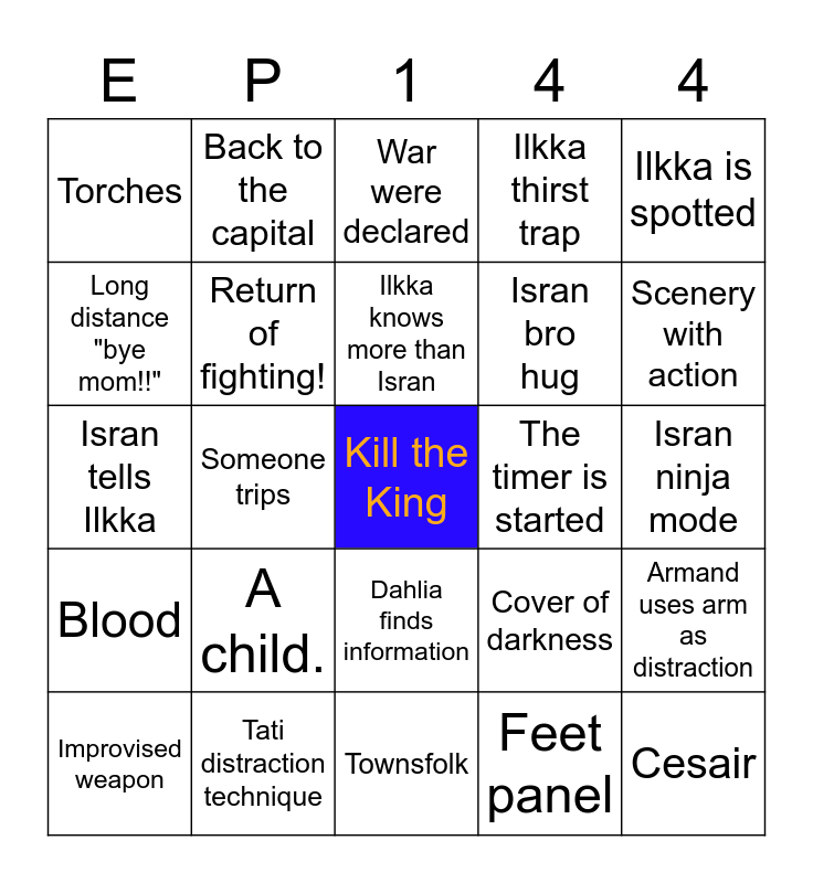This bingo card has a free space and 24 words: A child., Tati distraction technique, Ilkka knows more than Isran, Improvised weapon, Ilkka is spotted, Torches, Long distance "bye mom!!", Back to the capital, The timer is started, Dahlia finds information, Isran bro hug, Isran tells Ilkka, Cover of darkness, Armand uses arm as distraction, Return of fighting!, Feet panel, Isran ninja mode, War were declared, Scenery with action, Someone trips, Cesair, Blood, Ilkka thirst trap and Townsfolk.