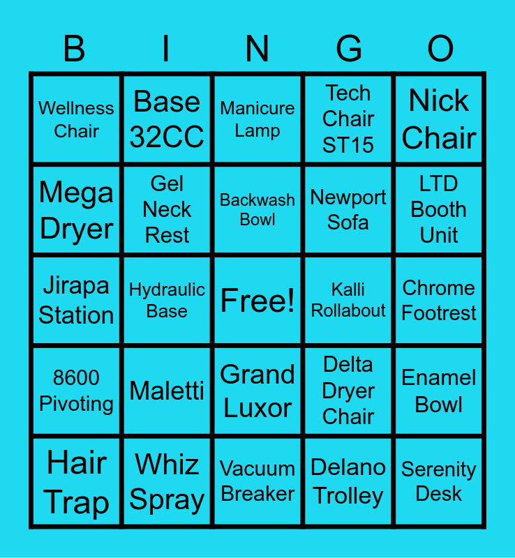 This bingo card has a free space and 24 words: Maletti, Whiz Spray, Backwash Bowl, Hair Trap, Nick Chair, Wellness Chair, Mega Dryer, Base 32CC, Kalli Rollabout, Grand Luxor, Newport Sofa, Jirapa Station, Delta Dryer Chair, Enamel Bowl, Gel Neck Rest, Delano Trolley, Chrome Footrest, Manicure Lamp, LTD Booth Unit, Hydraulic Base, Serenity Desk, 8600 Pivoting, Tech Chair ST15 and Vacuum Breaker.