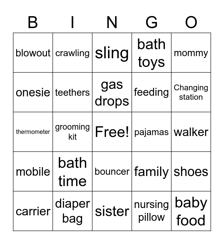This bingo card has a free space and 115 words: memory book, baby monitor, baby powder, baby swing, utensils, bassinet, bath toys, bathrobe, bathtub, bib, blanket, book, bottle, bottle brush, bottle drying rack, bottle warmer, bouncer, bowls and plates, burp cloths, car seat, carrier, sling, changing pad, complete outfit, crib, mobile, diaper bag, diaper cream, diapers, Booster seat, Changing station, gas drops, grooming kit, hat, high chair, hooded towel, humidifier, jumper, lotion, mattress cover, medicine, milk, mittens, musical toys, night light, nursery, nursing pillow, onesie, outlet covers, pacifier, pack-n-play, pajamas, piggy bank, play yard, playmat, plush toy, rattle, receiving blankets, rocking chair, safety gear, shoes, sippy cup, sleep sack, booties, spoons, stroller, swaddle, teethers, thermometer, toy box, walker, washcloths, wipe warmer, wipes, baby, baby food, bath time, blowout, burping, cradle, cravings, crawling, crying, family, feeding, formula, giggles, heartburn, hiccups, labor, love, lullaby, maternity, milk, mommy, nap time, newborn, nursery rhymes, pregnancy, rolling over, sonogram, spit-up, stork, stretch marks, tummy time, ultrasound, daddy, brother, sister, grandmother, grandfather, uncle, aunt, milestones and baby gate.