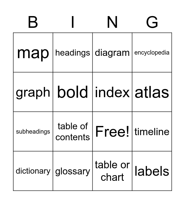 This bingo card has 19 words: Free!, caption, diagram, labels, timeline, graph, table or chart, map, headings, subheadings, table of contents, bold, index, glossary, dictionary, thesaurus, encyclopedia, atlas and web page.