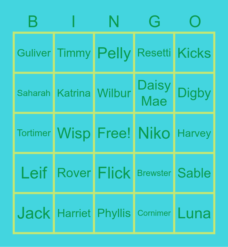 This bingo card has a free space and 66 words: Blathers, Celeste, Mable, Sable, Labelle, Tom Nook, Timmy, Orville, Wilbur, Isabelle, Flick, C.J, Harvey, Kicks, K.K. Slider, Saharah, Wisp, Guliver, Loyd, Daisy Mae, Rover, Leif, Resetti, Redd, Reece, Cyrus, Pascal, Gullivarrr, Luna, Zipper T. Bunny, Jack, Franklin, Jingle, Pave, Brewster, Harriet, Don, Tortimer, Cornimer, Kapp'n, Katrina, Lottie, Niko, Wardell, DJ KK, Joan, Digby, Lyle, Tommy, Copper, Booker, Katie, Porter, Leila, Dr. Shrunk, Blanca, Nat, Chip, Pelly, Phyllis, Pete, Wendell, Grams, Phineas, Gracie and Leilani.