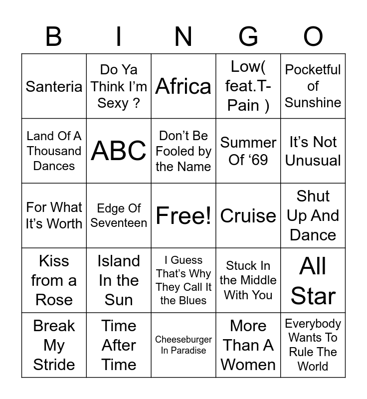 This bingo card has a free space and 69 words: Man In the Mirror, Shut Up And Dance, Ooops!… I Did It Again, Wonderwall, Time After Time, La Isla Bonita, Low( feat.T-Pain ), The Fresh Prince Of Bel - Air, Pocketful of Sunshine, La Bamba, All Star, Forget You, Santeria, Africa, My Girl, Edge Of Seventeen, I Guess That’s Why They Call It the Blues, Summer Of ‘69, Killer Queen, Kiss from a Rose, Cruise, Stuck In the Middle With You, It’s Not Unusual, Let’s Dance, Danger Zone, You Make My Dreams (Come True ), I Can't Go For That (No Can Do ), Surfin U.S.A, More Than A Women, Lido Shuffle, Do Ya Think I’m Sexy ?, All She Wants To Do Is Dance, Mr.Blue Sky, Don’t Bring Me down, Bring It On Home To Me, Roar, Bye Bye Bye, I Don’t Want To Miss A Thing, Land Of A Thousand Dances, Tequila, Island In the Sun, Everybody Wants To Rule The World, Video Killed The Radio Star Party In the U.S.A, Never Can Say Goodbye, Kokomo, Break My Stride, Maggie May, Hot For Teacher, The Stroke, ABC, Don’t Be Fooled by the Name, Low Rider, Give it Up, Cheeseburger In Paradise, Send Me On My Way, Lovely Day, Shake Your Groove Thing, Push it, Copacaband (at the copa)Honky Tonk Women, For What It’s Worth, I Can See Clearly Now, American Pie, Get Down On It, Tell It to My Heart, Holding out for a Hero, You Should Be Dancing, Why’d You Come in Here Lookin’ Like That, Just What I Needed and Don’t Lose My Number.
