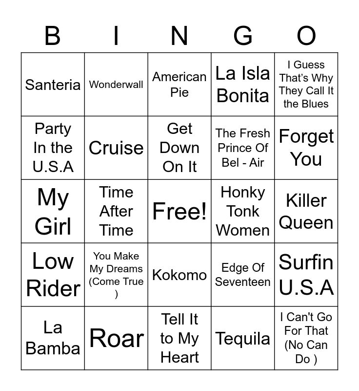 This bingo card has a free space and 72 words: Ooops!… I Did It Again, Wonderwall, Time After Time, How Will I Know, Gloria, Together Forever, La Isla Bonita, Low( feat.T-Pain ), The Fresh Prince Of Bel - Air, Pocketful of Sunshine, La Bamba, All Star, Forget You, Santeria, Africa, My Girl, Edge Of Seventeen, I Guess That’s Why They Call It the Blues, Summer Of ‘69, Killer Queen, You Make My Dreams (Come True ), I Can't Go For That (No Can Do ), Surfin U.S.A, More Than A Women, Lido Shuffle, Do Ya Think I’m Sexy ?, All She Wants To Do Is Dance, Mr.Blue Sky, Don’t Bring Me down, Bring It On Home To Me, Roar, Bye Bye Bye, I Don’t Want To Miss A Thing, Land Of A Thousand Dances, Tequila, Island In the Sun, Everybody Wants To Rule The World, Video Killed The Radio Star, Party In the U.S.A, Never Can Say Goodbye, Kokomo, Break My Stride, Maggie May, Hot For Teacher, The Stroke, Low Rider, Give it Up, Cheeseburger In Paradise, Send Me On My Way, Lovely Day, Shake Your Groove Thing, Push it, Copacabana (at the copa), Honky Tonk Women, For What It’s Worth, I Can See Clearly Now, American Pie, Get Down On It, ABC, Don’t Be Fooled by the Name, Why’d You Come in Here Lookin’ Like That, Just What I Needed, Don’t Lose My Number, Tell It to My Heart, Holding out for a Hero, Kiss from a Rose, Cruise, Stuck In the Middle With You, It’s Not Unusual, Let’s Dance, Danger Zone and You Should Be Dancing.