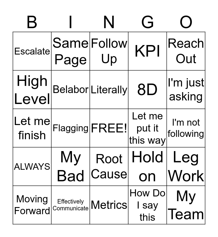 This bingo card has a free space and 24 words: My Bad, Effectively Communicate, Literally, Moving Forward, Reach Out, Escalate, High Level, Same Page, Let me put it this way, Root Cause, 8D, Let me finish, Hold on, Leg Work, Belabor, How Do I say this, I'm not following, Follow Up, I'm just asking, Flagging, My Team, ALWAYS, KPI and Metrics.