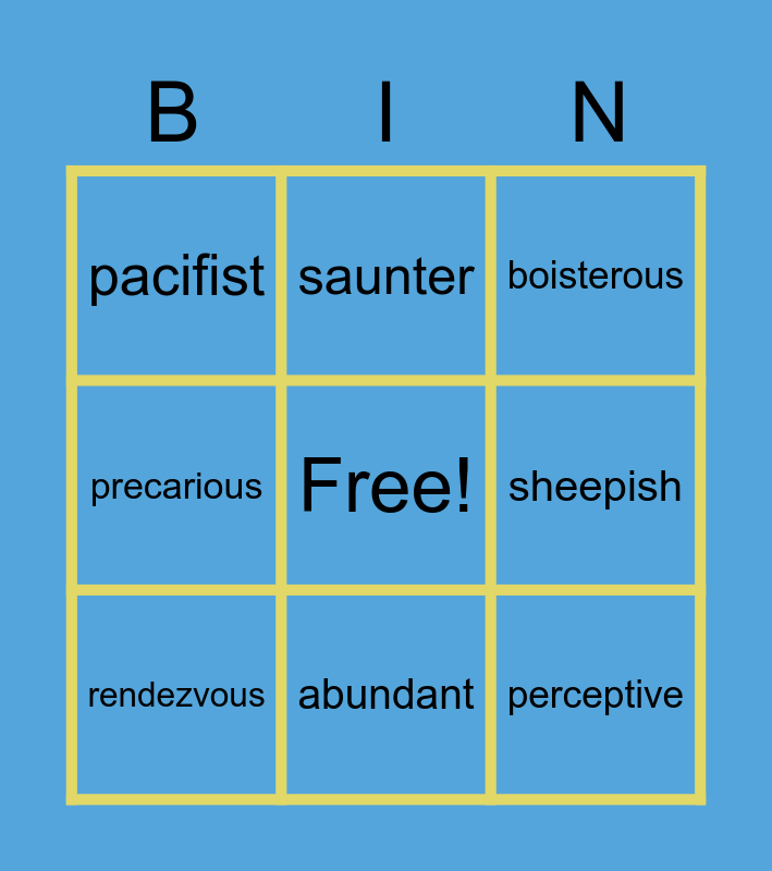 This bingo card has a free space and 10 words: abundant, boisterous, pacifist, perceptive, precarious, rendezvous, saunter, scarce, sheepish and solemn.