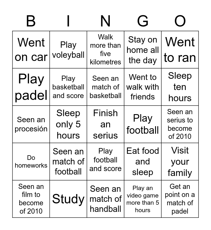 This bingo card has 25 words: Seen an match of football, Seen an match of handball, Seen an match of basketball, Seen an film to become of 2010, Went to ran, Went on car, Play padel, Play voleyball, Play football, Play football and score, Went to walk with friends, Seen an procesión, Eat food and sleep, Visit your family, Play basketball and score, Get an point on a match of padel, Seen an serius to become of 2010, Walk more than five kilometres, Sleep ten hours, Sleep only 5 hours, Finish an serius, Study, Do homeworks, Stay on home all the day and Play an video game more than 5 hours.