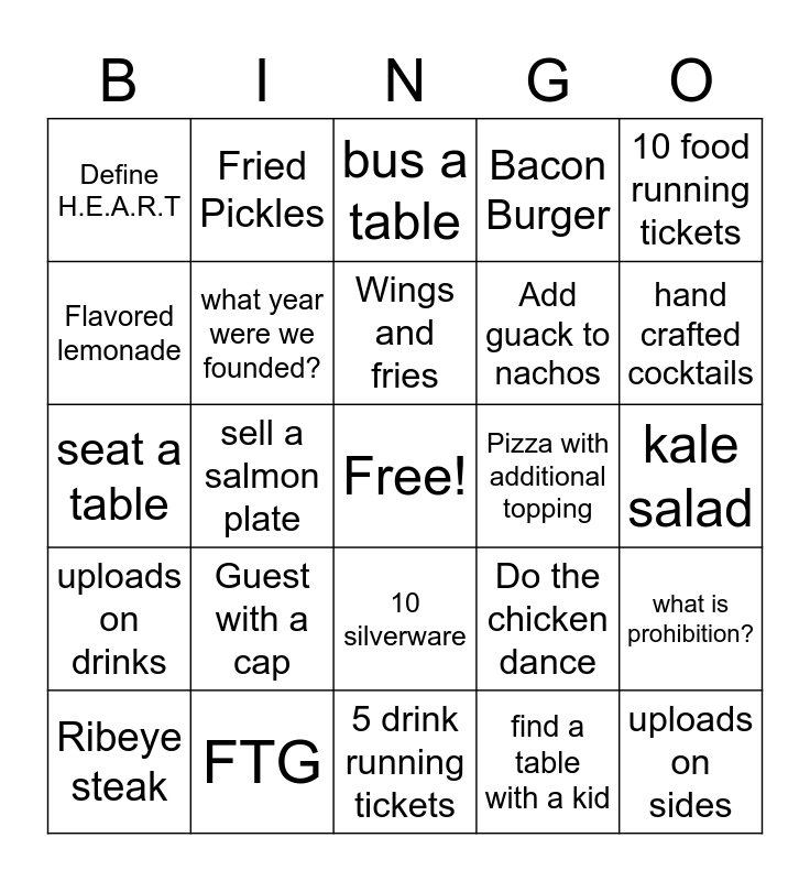 This bingo card has a free space and 24 words: Guest with a cap, FTG, Wings and fries, Ribeye steak, 10 food running tickets, Define H.E.A.R.T, Flavored lemonade, Fried Pickles, Pizza with additional topping, 10 silverware, Add guack to nachos, seat a table, Do the chicken dance, what is prohibition?, what year were we founded?, find a table with a kid, kale salad, bus a table, hand crafted cocktails, sell a salmon plate, uploads on sides, uploads on drinks, Bacon Burger and 5 drink running tickets.