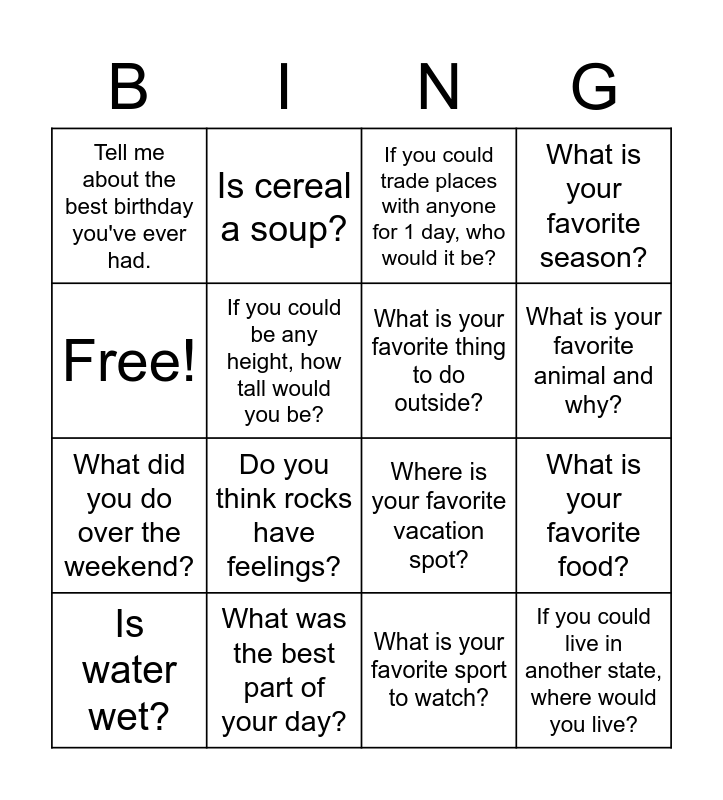 This bingo card has 16 words: What was the best part of your day?, What is your favorite food?, If you could trade places with anyone for 1 day, who would it be?, Tell me about the best birthday you've ever had., What did you do over the weekend?, Is cereal a soup?, Where is your favorite vacation spot?, What is your favorite sport to watch?, Free!, If you could be any height, how tall would you be?, Is water wet?, What is your favorite season?, Do you think rocks have feelings?, What is your favorite animal and why?, What is your favorite thing to do outside? and If you could live in another state, where would you live?.