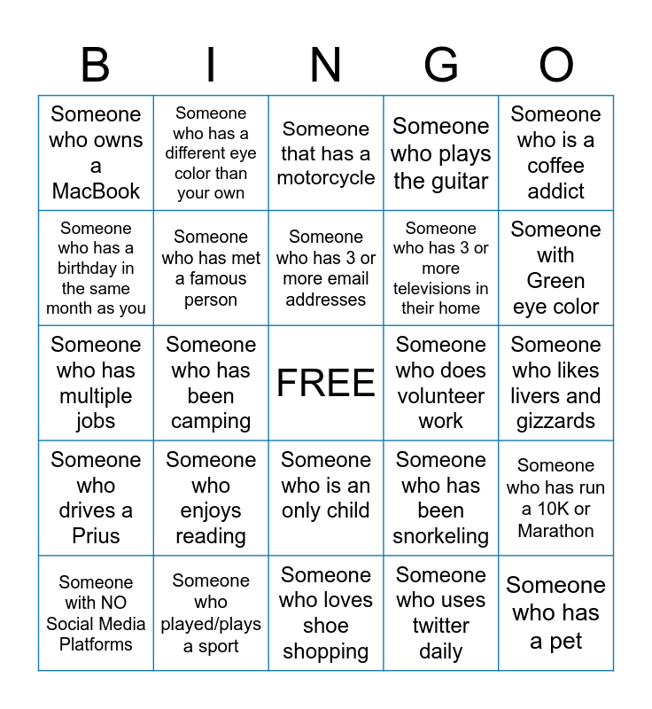 This bingo card has a free space and 49 words: Someone who can speak more than one language, Someone who has a pet, Someone who does not like chocolate, Someone who loves shoe shopping, Someone who enjoys reading, Someone who is the youngest in their family, Someone who has a different eye color than your own, Someone who hates to get up early in the morning, Someone who has a birthday in the same month as you, Someone who was born outside the US, Someone who has met a famous person, Someone who plays the guitar, Someone who has run a 10K or Marathon, Someone who has been snorkeling, Someone who likes sushi, Someone who exercises at least 3 times a week, Someone who has 3 or more email addresses, Someone who does volunteer work, Someone who has traveled to 3 or more countries, Someone who is a coffee addict, Someone who has been camping, Someone who uses twitter daily, Someone who owns a MacBook, Someone who has 3 or more televisions in their home, Someone with brown eye color, Someone with Green eye color, Someone with NO Social Media Platforms, Someone with a child taller than them, Someone who is an only child, Someone who drives a Prius, Someone who has a tattoo, Someone who likes spicy food, Someone who is NOT a morning person, Someone who likes cats, Someone who played/plays a sport, Someone who sings in shower, Someone who has been on a blind date, Someone who has freckles, Someone who likes livers and gizzards, Someone who has caught a fish, Someone who likes/collects reptiles, Someone who decorates every holiday, Someone who never swears, Someone who has a potty mouth., Someone who has multiple jobs, Someone that has a motorcycle, Someone who owns more than 1 pet, Someone who eats out more than 3 times/week and Someone who makes dinner every night.
