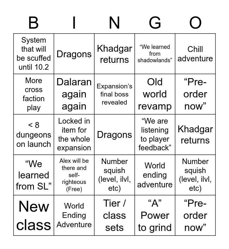⚠ This card has duplicate items: Dragons (2), New race (2), New class (2), System that will be scuffed until 10.2 (2), “A” Power to grind (2), Khadgar returns (2), Chill adventure (2), “We are listening to player feedback” (2), Number squish (level, ilvl, etc) (2), Alex will be there and self-righteous (Free) (2), Great looking gear you can’t acquire (npc gear) (2), Tier / class sets (2), Locked in item for the whole expansion (2), < 8 dungeons on launch (2), Player / guild housing (2), “Pre-order now” (2)