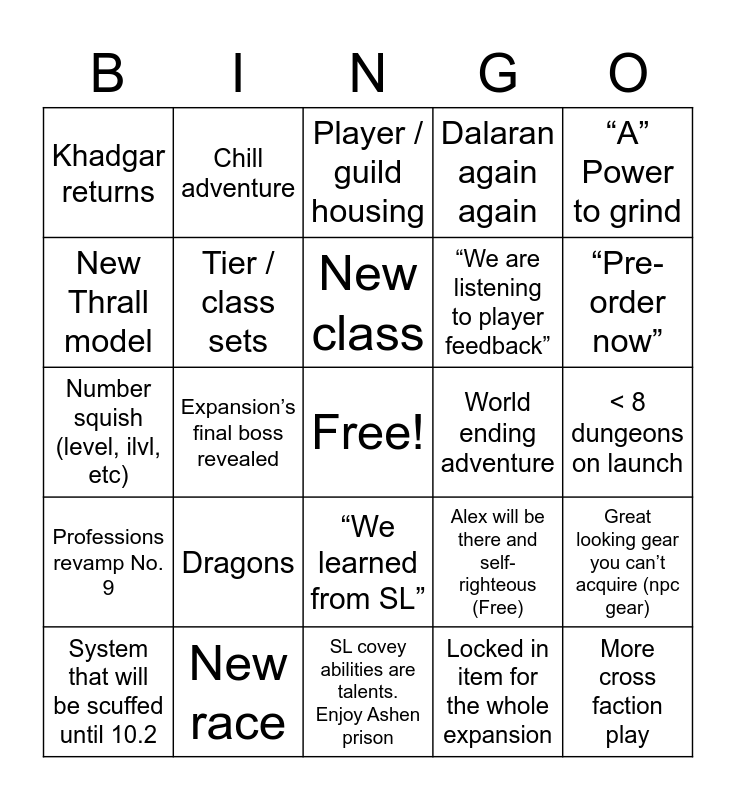 This bingo card has a free space and 24 words: Dragons, New race, New class, System that will be scuffed until 10.2, “A” Power to grind, Khadgar returns, New Thrall model, Chill adventure, World ending adventure, “We learned from SL”, “We are listening to player feedback”, Number squish (level, ilvl, etc), Alex will be there and self-righteous (Free), Great looking gear you can’t acquire (npc gear), Tier / class sets, Locked in item for the whole expansion, < 8 dungeons on launch, Player / guild housing, “Pre-order now”, Expansion’s final boss revealed, More cross faction play, Professions revamp No. 9, Dalaran again again and SL covey abilities are talents. Enjoy Ashen prison.