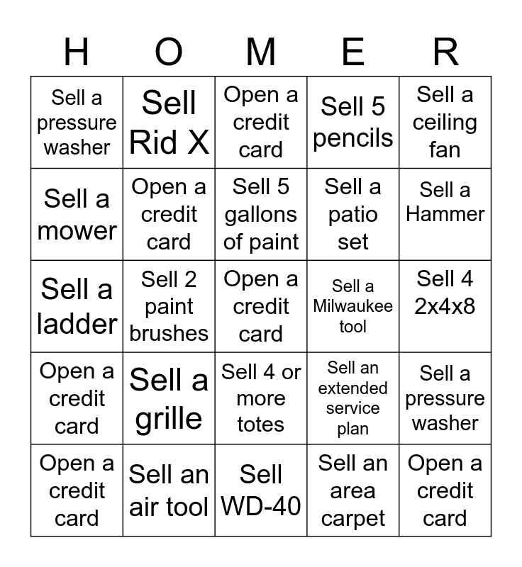 This bingo card has a free space and 24 words: Open a credit card, Sell a grille, Sell 5 gallons of paint, Sell an area carpet, Sell a ceiling fan, Sell a pressure washer, Sell Rid X, Open a credit card, Sell a Milwaukee tool, Sell 4 2x4x8, Sell a ladder, Open a credit card, Sell an extended service plan, Sell a pressure washer, Sell a mower, Sell an air tool, Sell WD-40, Sell 5 pencils, Sell a Hammer, Open a credit card, Sell 2 paint brushes, Sell 4 or more totes, Sell a patio set and Open a credit card.