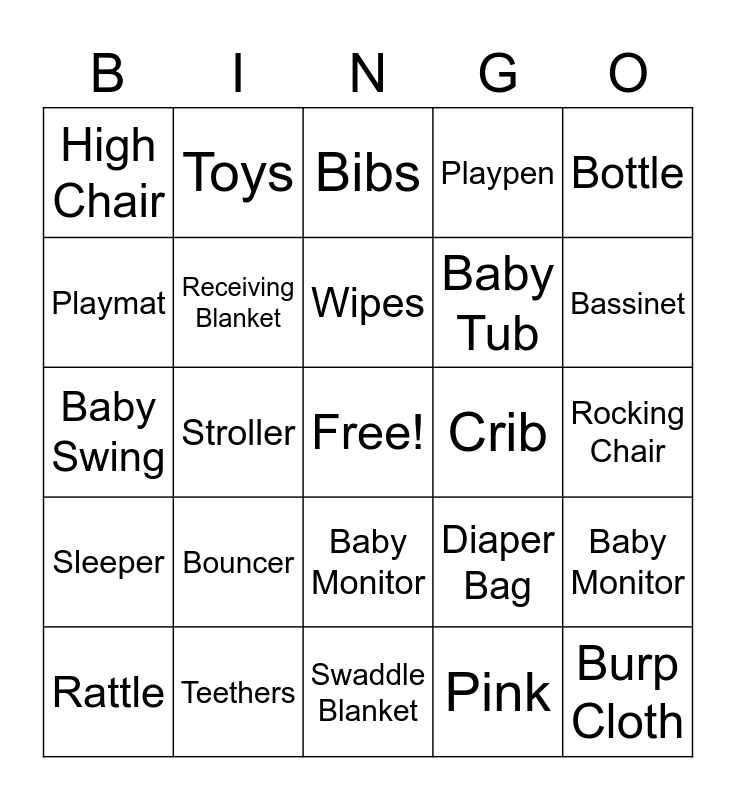 This bingo card has a free space and 33 words: Pacifier, Car Seat, Stroller, Onesie, Sleeper, Receiving Blanket, Bottle, Rattle, Toys, Diapers, Wipes, Bibs, Boy, Girl, Crib, Bassinet, Teethers, Baby Swing, Bouncer, Diaper Bag, Baby Monitor, Nasal Aspirator, High Chair, Rocking Chair, Swaddle Blanket, Burp Cloth, Playpen, Baby Tub, Playmat, Baby Monitor, Changing Table, Pink and Blue.
