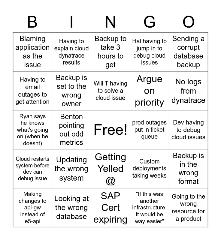 This bingo card has a free space and 24 words: Updating the wrong system, Looking at the wrong database, Will T having to solve a cloud issue, Making changes to api-gw instead of e5-api, Sending a corrupt database backup, Blaming application as the issue, Having to email outages to get attention, Having to explain cloud dynatrace results, prod outages put in ticket queue, Getting Yelled @, Argue on priority, Ryan says he knows what's going on (when he doesnt), Custom deployments taking weeks, Backup is in the wrong format, Backup is set to the wrong owner, "If this was another infrastructure, it would be way easier", Dev having to debug cloud issues, Backup to take 3 hours to get, No logs from dynatrace, Benton pointing out odd metrics, Going to the wrong resource for a product, Cloud restarts system before dev can debug issue, Hal having to jump in to debug cloud issues and SAP Cert expiring.