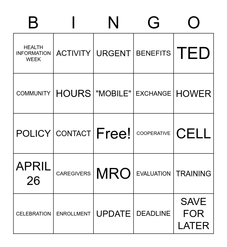 This bingo card has a free space and 25 words: CAREGIVERS, UPDATE, "MOBILE", CELEBRATION, TED, HEALTH INFORMATION WEEK, COMMUNITY, ACTIVITY, COOPERATIVE, MRO, EXCHANGE, POLICY, EVALUATION, TRAINING, HOURS, 10 YEAR, CELL, URGENT, HOWER, CONTACT, SAVE FOR LATER, ENROLLMENT, APRIL 26, BENEFITS and DEADLINE.