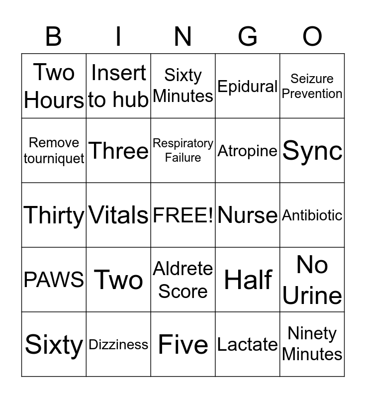 This bingo card has a free space and 24 words: Two, Dizziness, Respiratory Failure, Sixty, Seizure Prevention, Two Hours, Remove tourniquet, Insert to hub, Nurse, Aldrete Score, Atropine, Thirty, Half, No Urine, Three, Lactate, Antibiotic, Sixty Minutes, Sync, Vitals, Ninety Minutes, PAWS, Epidural and Five.