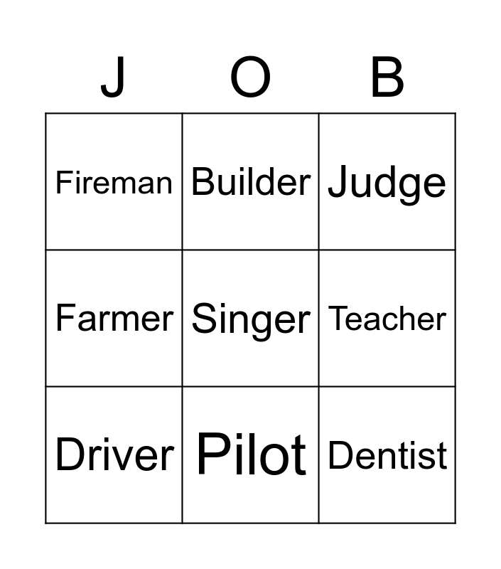 This bingo card has 14 words: Hairdresser, Singer, Dentist, Farmer, Builder, Judge, Journalist, Mechanic, Doctor, Fireman, Pilot, Teacher, Driver and Police officer.