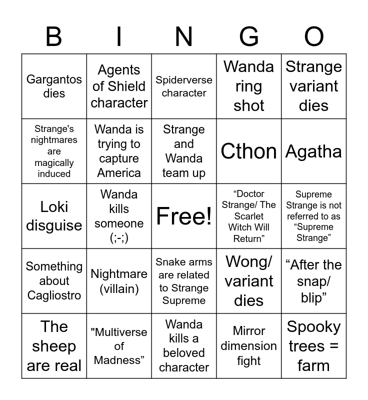 This bingo card has a free space and 103 words: Vision variant, Wanda variant dies, Strange variant dies, Infinity Ultron, The Watcher, Absolute Points, Child Billy or Tommy, Defender Strange is evil, Sinister Strange and Strange Supreme are different, Mordo dies, Time stone, Strange variants combine power, Strange Supreme wings, Professor X is a variant, Wanda learns about Multiverse through Chaos magic, Fietro = Peter Maximoff, Spiderverse character, Loki, Strange Supreme shaves, "Who is Peter Parker", Pocket Dimension, Sacred Timeline, Clea, Iron Man variant, D'Spayre, Nightmare (villain), Agatha, Wanda ring shot, Supreme Strange part of Illuminati, Wanda talks to her children, Wong/ variant dies, Mirror dimension fight, Cloak of Levitation casualty, 3 end credit scenes, 3+ Wanda variants, Scarlet Witch castle, Zombie Wanda, Kang/ variant, Strange and Wanda team up, "Multiverse of Madness”, Christine’s husband dies, Something about Cagliostro, Monica or Maria Rambeau variant is Captain Marvel, Strange's nightmares are magically induced, Wanda hears her children's voices, Gargantos dies, Wanda summons an enemy, Spooky trees = farm, Darkhold causes darkened fingers, Insignificant MCU reference (e.g. Rogers), Illuminati, Cartoon dimension is comics, Cape with shield is still Cloak of Levitation, Defender strange = decaying/ zombie strange, Sara is Wong's love interest, Something/ someone is inside Rintrah's lamp, America backstory dumps, New important revelations about the Multiverse (see Loki), Wanda attacks the Kamar-taj, Snake arms are related to Strange Supreme, Supreme Strange is not referred to as “Supreme Strange”, Illuminati robots are Ultron bots, Wanda mind-controls someone, Mobius, Sylvie, Flashbacks, Other Defenders Saga character, Agents of Shield character, Loki disguise, Wanda kills someone (;-;), Wanda kills a beloved character, A teaser trailer scene never appears, A trailer #1 scene never appears, Book of Vishanti, Daredevil character, Captain Carter, Wanda uses runes, The sheep are real, A relic with an unpronounceable name, A key plot point is in Rintrah's genie lamp, America punches Wanda, The entire plot was from a leak, Wanda is trying to capture America, The glass case scenes in the trailer were in fact edited, “Doctor Strange/ The Scarlet Witch Will Return”, Shang-Chi or Ten Rings0, The Illuminati have Wanda’s children, Strange loses a sling ring, A key plot point/ information is found in a random Kamar-taj book, Strange cries, Strange makes Christine an accessory in his magical adventure, No Strange Supreme shapeshifting scenes, “After the snap/ blip”, Thanos mentioned, Scene from snap victim (what happened to them in the snap), Someone is magically disguised, Cthon, Evil villain is someone else we haven’t theorized/ expected, At least one X-man besides Professor X, Demons, Wanda did not summon Gargantos (Strange Supreme? 👀), One of Kat’s Random Theories is correct! and America likes pizza.