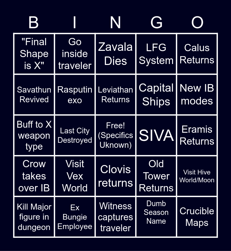 This bingo card has a free space and 24 words: Visit Vex World, Ex Bungie Employee, Leviathan Returns, Kill Major figure in dungeon, Calus Returns, "Final Shape is X", Savathun Revived, Go inside traveler, SIVA, Clovis returns, Capital Ships, Buff to X weapon type, Old Tower Returns, Visit Hive World/Moon, Rasputin exo, Dumb Season Name, Eramis Returns, Zavala Dies, New IB modes, Last City Destroyed, Crucible Maps, Crow takes over IB, LFG System and Witness captures traveler.