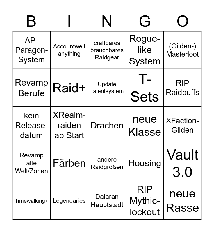 This bingo card has a free space and 24 words: Färben, Legendaries, Update Talentsystem, Timewalking+, (Gilden-) Masterloot, AP- Paragon-System, Revamp Berufe, Accountweit anything, neue Klasse, andere Raidgrößen, T-Sets, kein Release-datum, Housing, Vault 3.0, Raid+, RIP Mythic-lockout, XFaction-Gilden, craftbares brauchbares Raidgear, RIP Raidbuffs, XRealm-raiden ab Start, neue Rasse, Revamp alte Welt/Zonen, Rogue-like System and Dalaran Hauptstadt.