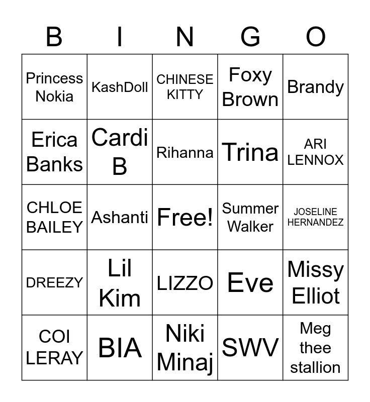This bingo card has a free space and 49 words: City Girls, Meg thee stallion, Mulatto, Niki Minaj, Lil Kim, BIA, KashDoll, Yung Baby Tate, Erica Banks, Sawatie, Cardi B, Foxy Brown, Missy Elliot, Eve, Beyonce, Aaliyah, Rihanna, Summer Walker, SZA, Brandy, Ashanti, SWV, Princess Nokia, Trina, H.ER, ARI LENNOX, COI LERAY, MUNI LONG, LIZZO, DREEZY, NORMANI, VICTORIA MONET, MYA, KEHLANI, BIA, DREAM DOLL, ASIAN DOLL, RUBI ROSE, JOSELINE HERNANDEZ, RICO NASTY, FLO MILLI, OMERETTA, QUEEN NAIJA, MARIAH CAREY, CHLOE BAILEY, CHINESE KITTY, JHENE AIKO, DANILEIGH and LAYA.